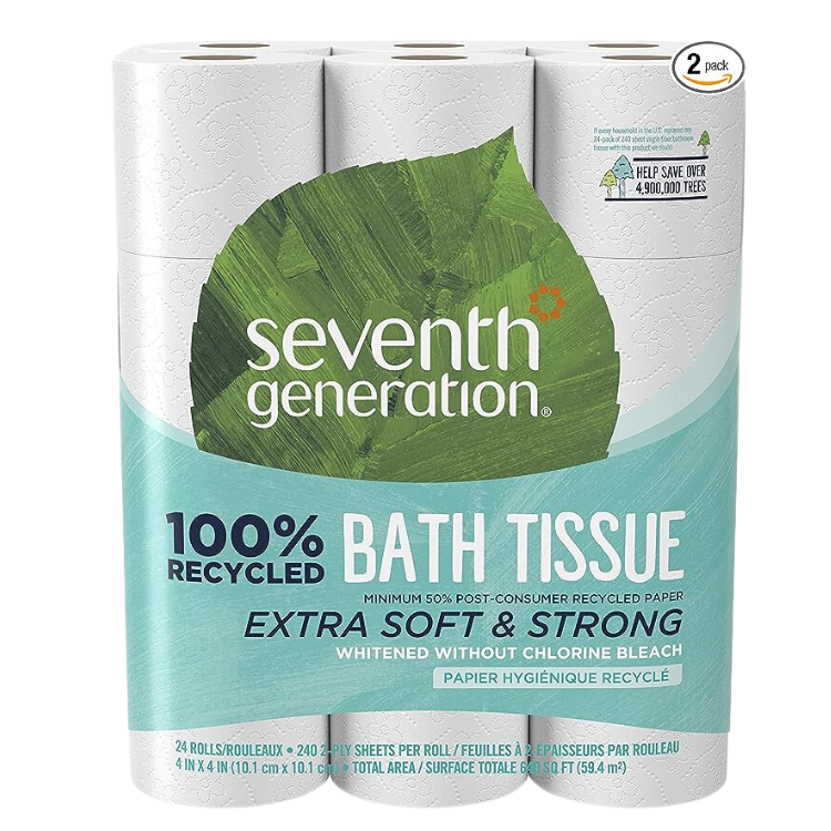 Seventh Generation Toilet Paper White Bathroom Tissue 2-ply 100% Recycled Paper without Chlorine Bleach 24 count, (Pack of 2)