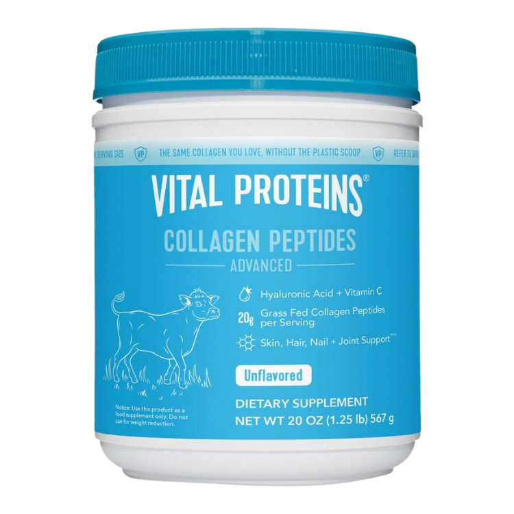 - Vital Proteins Collagen Peptides Advanced is a premium offering with 20g collagen peptides per serving plus two additional functional ingredients – 100% daily value vitamin C and 80 mg hyaluronic acid. Vitamin C helps to support the body’s natural collagen production while hyaluronic acid helps to improve skin hydration and joint mobility.**^ Our product quantity is based on weight, not canister size.